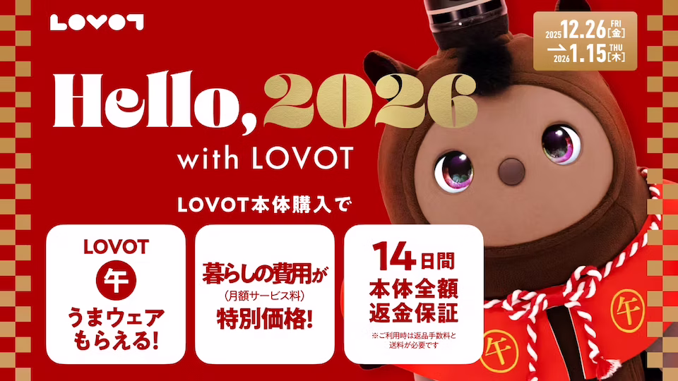 | Hello, 2026 with LOVOT 25-12-26〜26-1-15 | ・LOVOT用の午ウェア ・最大6ヶ月フルカバーケアプランが月々¥6,820安くなる ・14日間本体全額返金保証 |